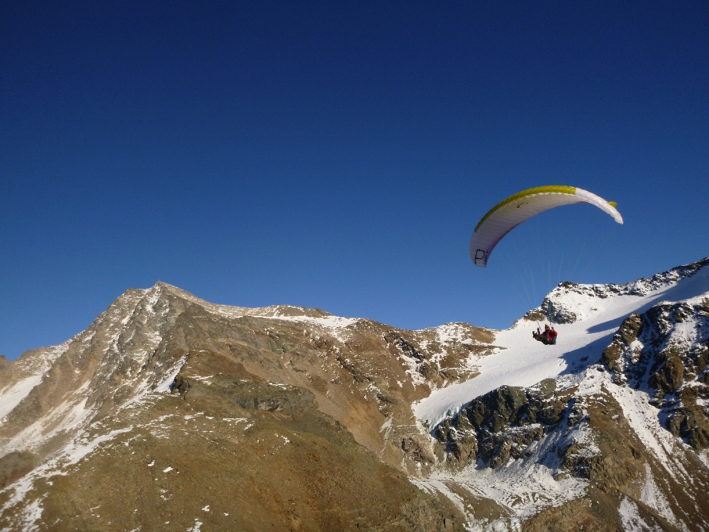 Vor allem für Michl, der mit dem UFO unterwegs war, da wir den Gipfel umfliegen mussten und über eine Gratkette Richtung Sulden fliegen mussten. Alles andere wäre keine echte Alternative gewesen. Nach meinem Start bog ich gleich nach links ab und in „Ameisenkniehöhe“ ging es Richtung Grat. Für die erste Scharte war ich zu tief, aber bei der zweiten war es bei mir perfekt. Ich hatte richtig gute Höhe. Pah ich liebe meinen PI23.