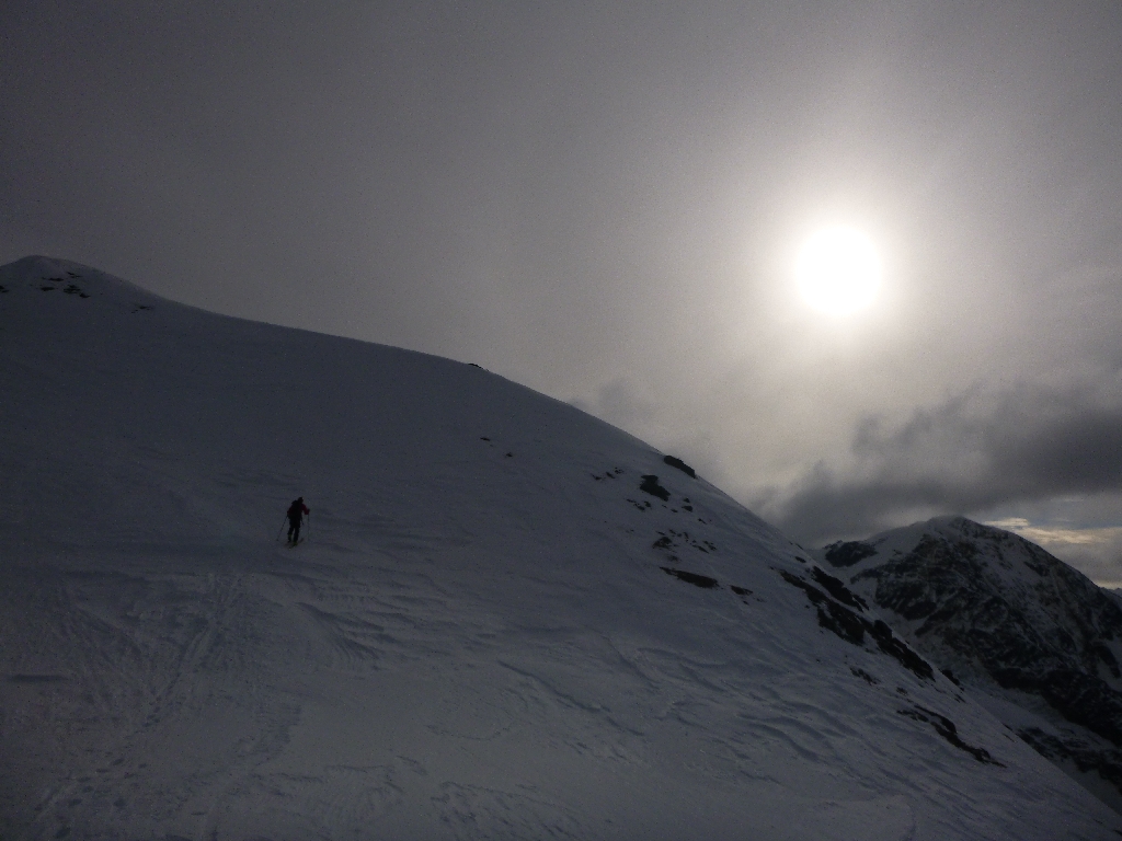 Oben am Gipfel waren wir noch guter Dinge, aber der Wind kam genau aus dem Süden und noch dazu mit lockeren 30 km/h, wenn nicht stärker. So ein Dreck, bei Süd kommen wir nicht weg. Irgendwie hoffte ich noch, dass der Wind irgendwann westlicher drehen würde, aber die Hoffnung stirbt bekanntlich zuletzt und so stiegen wir über den Normalweg wieder ab.