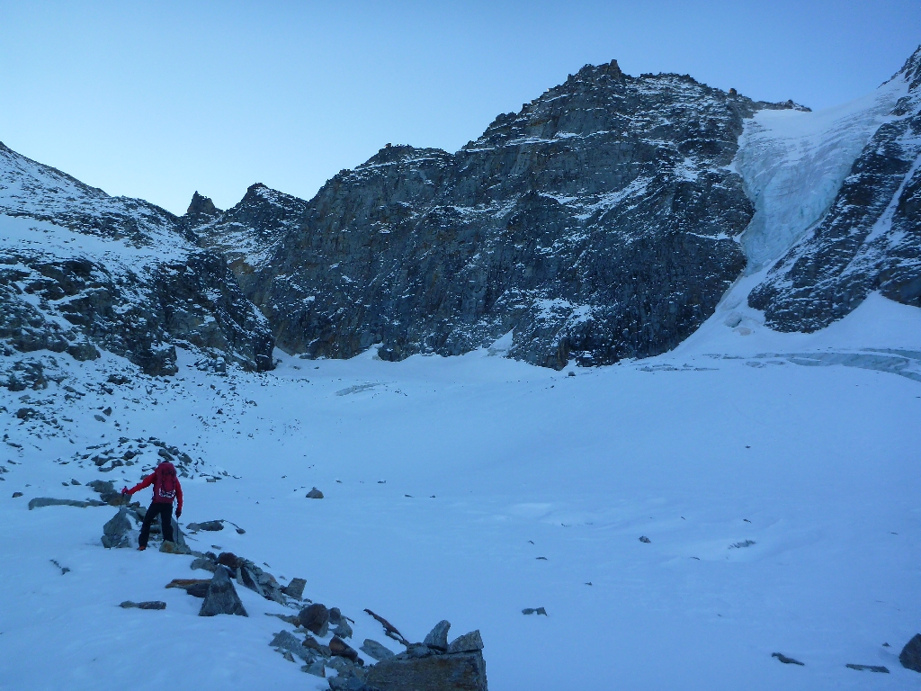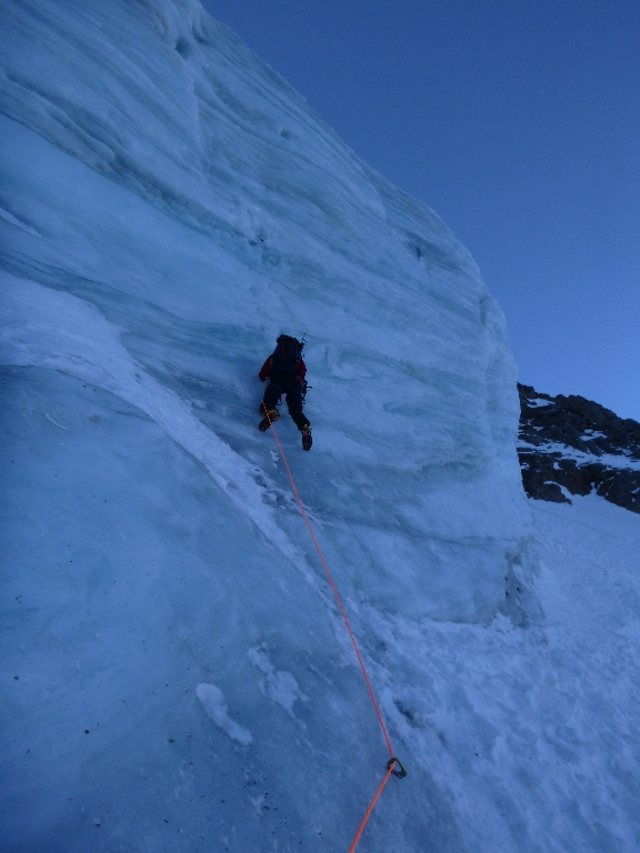 Bei Sonnenaufgang waren wir bei der Hütte. Dort war dann auch um einiges mehr an Schnee und wir konnten bis zum Einstieg spuren, was bei hüfthohem Schnee teilweise ganz schön kräftezehrend war. Auch am Gletscher waren die fetten Spalten offen und wir wählten eine gute Linie. Der Bergschrund war völlig unproblematisch.