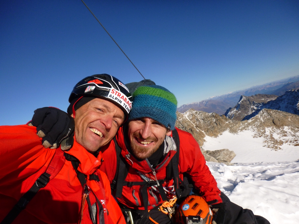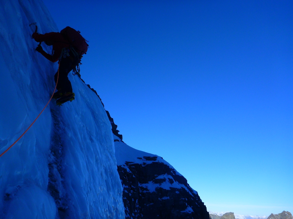 Aus Gewichtsgründen kletterten wir auch nur mit einem Halbseil, aber aus unserer Sicht mehr als ausreichend. Im oberen Bereich waren dann wieder ein paar fette Spalten. Somit blieben wir am Seil. Oben am Grat konnten wir das erste Mal wieder Sonne tanken. Für mich persönlich immer ein ganz besonderer Moment, wenn man von der kalten Nordwand die ersten warmen Sonnenstrahlen spürt.