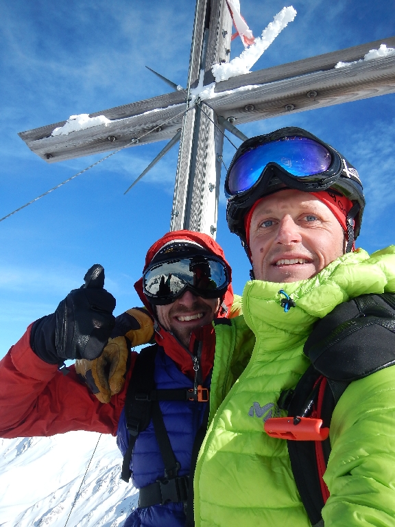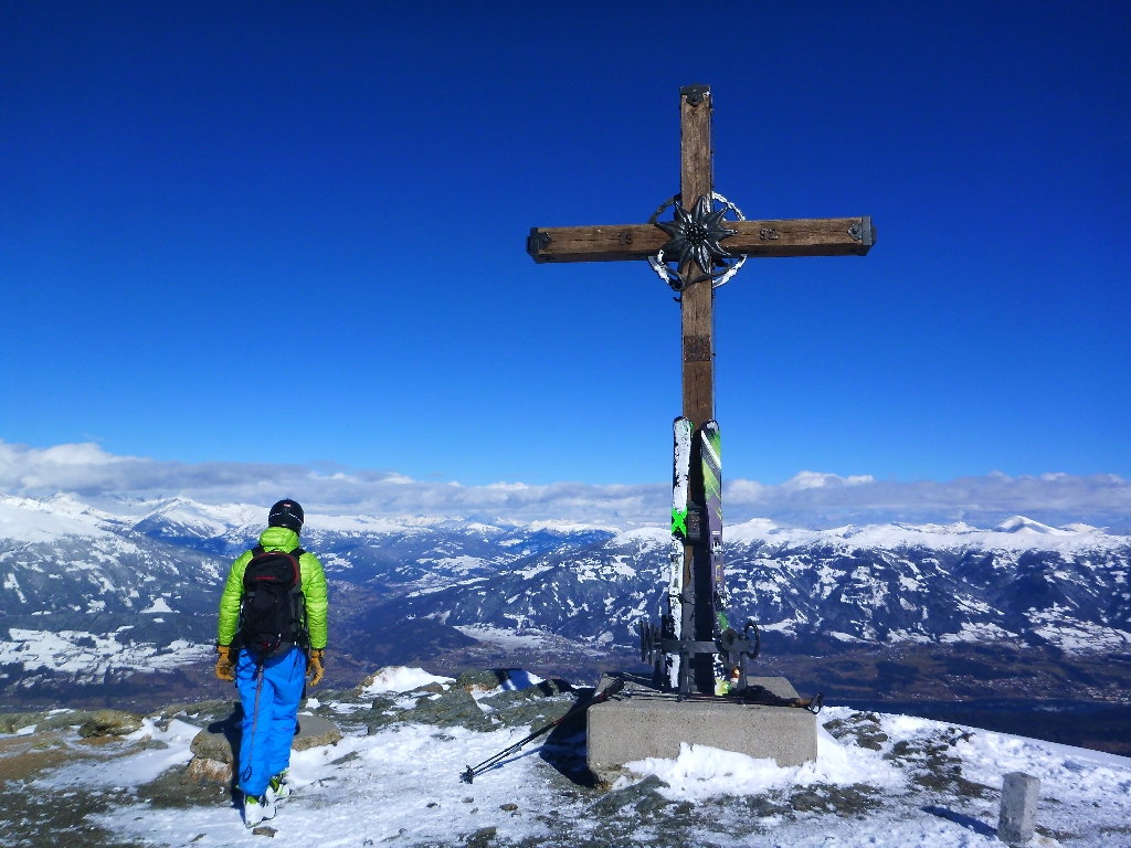 Konstant und ohne Pause ging es in der guten Spur Richtung Gipfel. Leider waren die Hänge schon zerfahren, aber mit dem breiten Ski macht auch sowas richtig Spaß. Am Gipfel trafen wir lustigerweise ein Niederösterreich-Oberösterreich-Gespann. Mödlinger, Badener waren auch dabei, aber wir kannten uns nicht. Von ihnen bekamen wir jedoch den Tipp, auf der anderen Seite abzufahren. Das sollte richtig lässig sein, so wurde es uns erzählt. Interessanterweise entschloss sich die Partie jedoch nicht dort abzufahren.