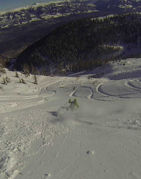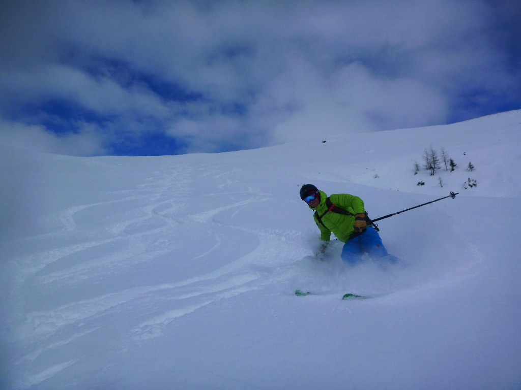 Jürgen und ich wollten es aber wissen. Zuerst den Grat hinunter und dann die steile Flanke. Puh, doch steiler und sicher zum Aufpassen aber die Abfahrt war dann einfach mördergeil. Unglaublich. Pulver bis zu den Knien und mit den fetten Ski ist das ja fast wie fliegen. Unglaublich geil. Über einen steilen Rücken waren wir dann bald wieder unten bei der Bad´l Alm. Dort kehrten wir dann ein und aßen Spinatknödel mit einem guten Bier. Pah ist das Leben schön!
