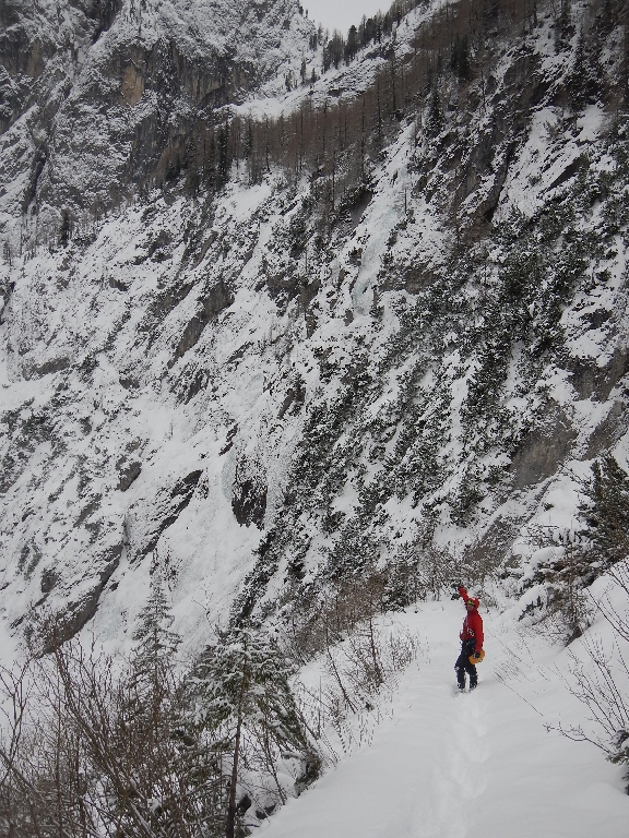 Dort trafen wir auch einen Bergführer, welchen wir nach Eisverhältnissen fragten, und er meinte, “dass der Obstanser Eisfall in Kartitsch in gutem Zustand ist“. Geile Info, Jürgen war auch schon lange in keinem Fall mehr und so kam uns dieser „leichte“ Wasserfall genau richtig. Um uns ein Bild zu machen, wollten wir uns den Fall noch kurz anschauen. Somit fuhren wir Richtung Kartitsch zum Sportzentrum und wanderten gemütlich die 45 Minuten Richtung Einstieg. Der Wasserfall war super beieinander, auch wenn er durch einiges an Neuschnee bedeckt war.