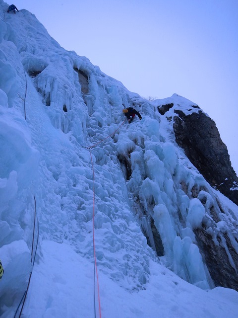 Irgendwie bildete ich mir ein, dass ich da schon einmal war, aber ich konnte in meinem Tourenbuch nichts finden. Naja werde auch schon alt. Nach einer kalten Nacht starteten wir am nächsten Morgen Richtung Wasserfall. Eine Seilschaft war bereits im Fall, aber diese entschieden sich für den Linken Einstieg. Somit waren wir uns nicht im Weg. Oben vor den Leichten Längen haben wir uns dann wieder getroffen und sind über den tief Winterlichen Sommerweg wieder abgestiegen.