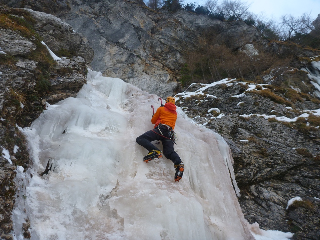 Und diese ist in diesem Fall perfekt, egal ob mit oder ohne Helm, sie passt eigentlich immer! Aber alles der Reihe nach. Vor Weihnachten habe ich wie immer ein perfekt verpacktes Paket von den Bergfreunden bekommen. Ausgepackt und ab damit unter die Dusche. Die Jacke soll ja wasserdicht sein und ob sie das hält oder nicht, kann am besten in der Dusche getestet werden. Außerdem erkenne ich sofort, ob es fehlerhafte Stellen (Nähte) gibt, welche ich im gegeben Fall reklamieren könnte. Alles dicht und sauber verarbeitet, wie ich es von Patagonia gewohnt bin. Nachdem die Eisklettersaison bei uns schon voll im Gang war, wollten wir uns das Gaisloch im großen Höllental (Niederösterreich 90 Meter Wasserfall) ansehen. Leider hatte dieser noch viel zu wenig Eis, um richtig gut klettern zu können. Aber wir fanden eine neue Mixedlinie, die über einen Eiszapfen zum Top führte.
